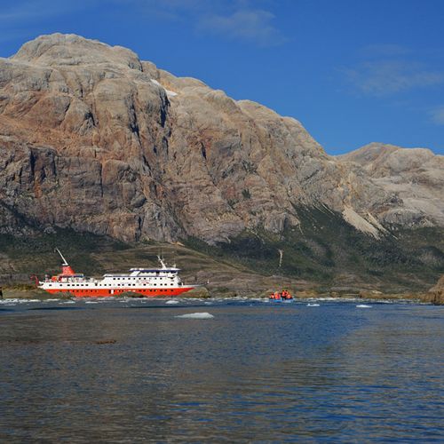 09:30 hrs. Visita al Glaciar Alsina, desembarco en nuestros botes de exploración para recorrer esta pequeña bahía y su vistoso glaciar apreciando toda su belleza y sus enormes montañas que lo rodean.